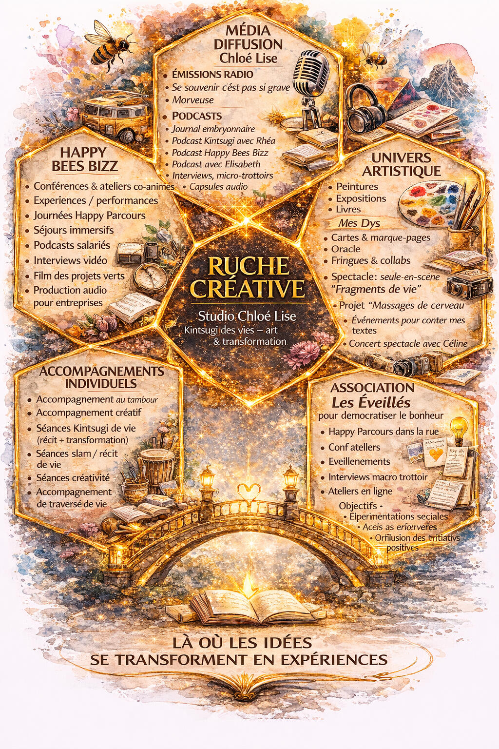 Je les ai donc tous listé: ils sont 17!Six d'entre eux ont été placés en "couveuse à projets géniaux" dans un joli bocal en verre avec des coeurs, en attendant la naissance de leurs frères & soeurs.Deux d'entre eux se sont arrêtés assez naturellement.28/29 mars : Première Co exposition avec mon papa dans une galerie d'art dans le Marais à Paris.17 Avril : Première scène pour ma sortie de résidence à Angoulême avec mon seule en scène "Fragments de vie".Avril / mai : Participation à deux retraites d'une femme-médecine Lisandra Janaina venue du Brésil pour nous transmettre les sagesses ancestrales sur les gardiennes des cycles et la Parteria traditionnelle.23 mai : 2e représentation de "Fragments de vie" au théâtre de la Divine Comédie à Paris.28 mai / 20 juillet : Pèlerinage & Voyage en Géorgie, & lancement de mon projet documentaire vidéo.31 août: Concert au festival de la petite forêt accompagnée de trois musiciens.9 octobre / 9 décembre: Formation "Elles créent" pour l'accompagnement des entrepreneures innovantes pour la création de ma start up Happy Bees Bizz.15 décembre: Publication de mon premier livre "Et grandir..." aux éditions de l'Onde.2026Mi janvier: Résurgence traumatique qui va durer deux mois.Février: Formation d'un duo guitare-voix en vue d'un premier concert pour le Gonzess'Fest en mai.Mars: Création de mon éclosystème "La ruche créative", qui va rassembler mes accompagnements Mieux-être en entreprise, mon univers artistique, mes accompagnements individuels, mon association qui oeuvre à démocratiser le bonheur depuis 2016, avec une alvéole Média/diffusion pour promouvoir tout ce cercle vertueux.